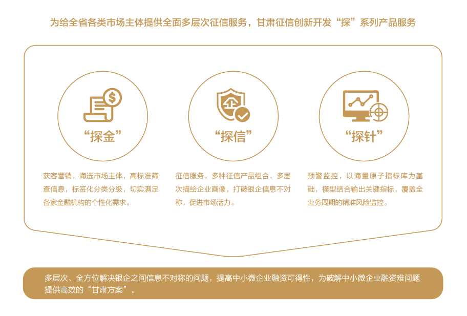 甘肅征信建立以征信數據庫、數據處理系統、征信智能應用系統為核心的企業征信服務平臺,為客戶提供征信報告、信息核驗、信用評分、智能風控分析決策等綜合信用服務,實現在線經濟金融、社會管理、公共服務等多領域的廣泛應用。