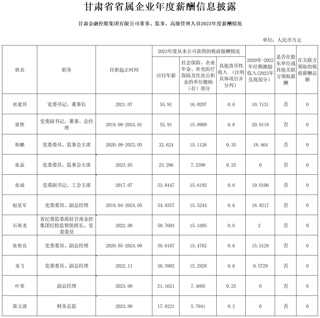 甘肅金融控股集團有限公司董事、監事、高級管理人員2023年度薪酬情況